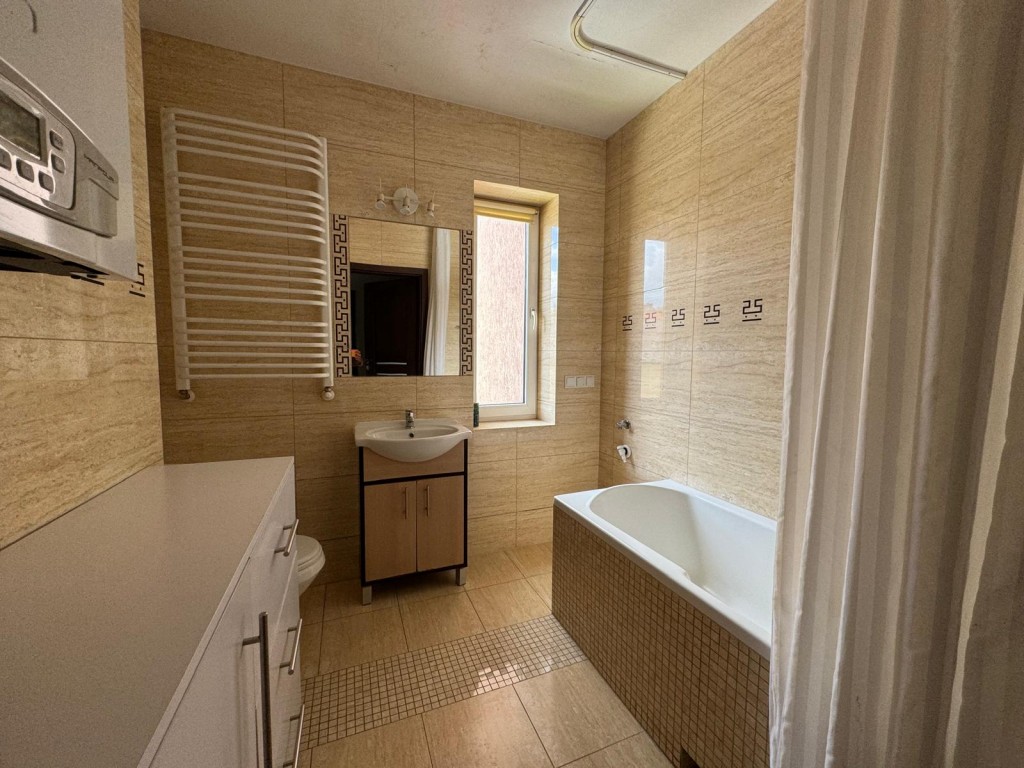 Mieszkanie umeblowane, kuchnia w pełni wyposażona (lodówka, kuchenka gazowa); w łazience wanna, na podłogach panele i płytki.
