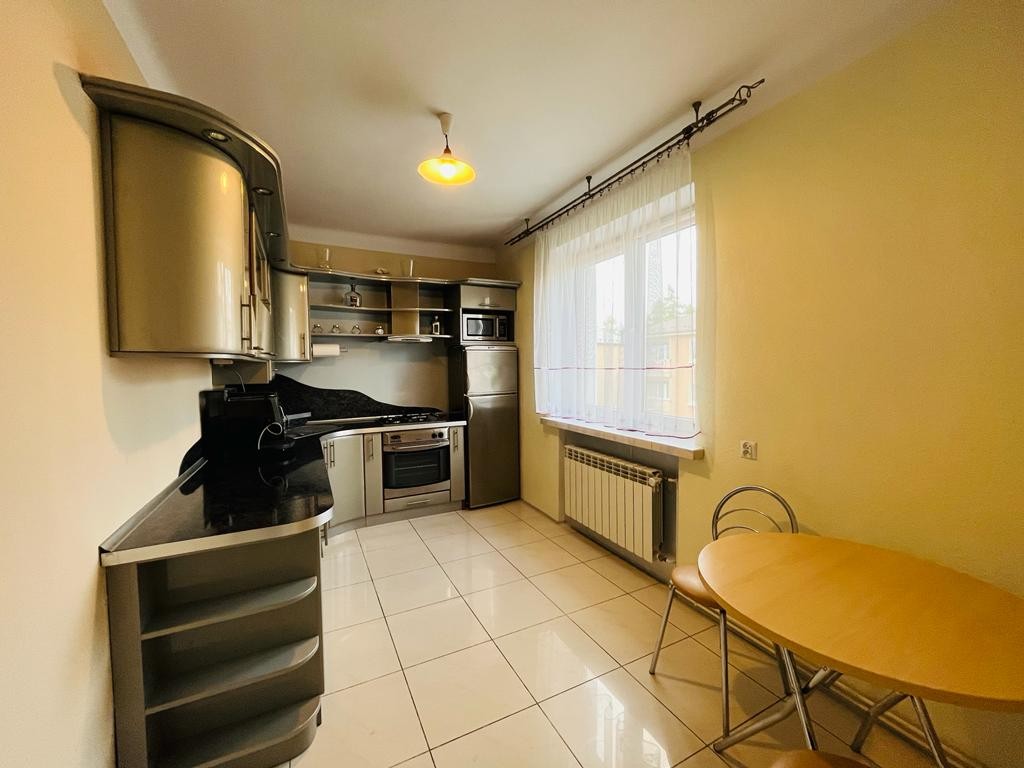 Kuchnia w pełni umeblowana i wyposażona w sprzęty takie jak: kuchenka z piekarnikiem, lodówka, mikrofalówka. W łazience znajduje się wanna, pralka, piec dwufunkcyjny gazowy. Na podłogach w całym mieszkaniu panele; w łazience i kuchni płytki. Centralne ogrzewanie piecem gazowym dwufunkcyjnym. Parking na ulicy.