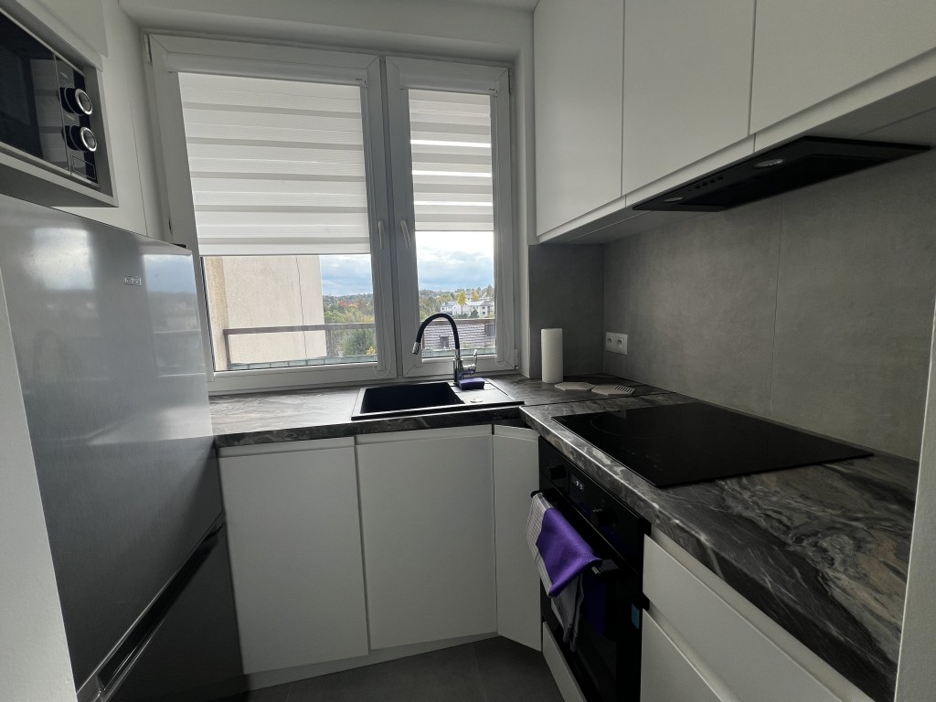 - Kuchnia: meble w zabudowie, lodówka, mikrofalówka, płyta indukcyjna