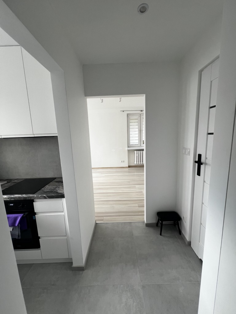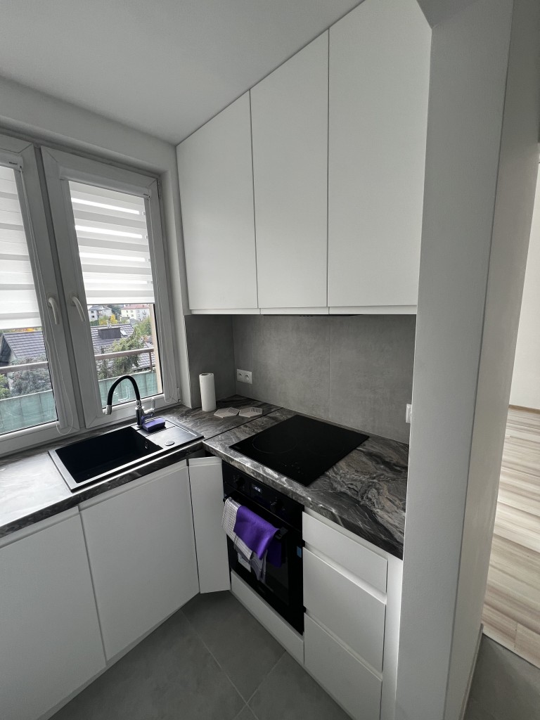 - Podłogi: panele (pokój), płytki (kuchnia i łazienka)
