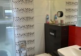 Z dwóch łazienek – jedna posiada wannę i kabinę prysznicową, druga zabudowaną pralkę z półkami.