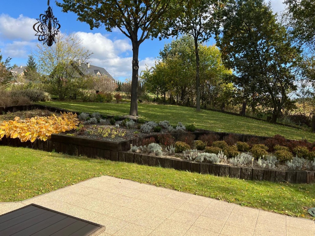Dom otoczony jest w pełni zagospodarowanym ogrodem z roślinami ozdobnymi i krzewami owocowymi oraz podziemnym systemem umożliwiającym wygodne podlewanie całości.