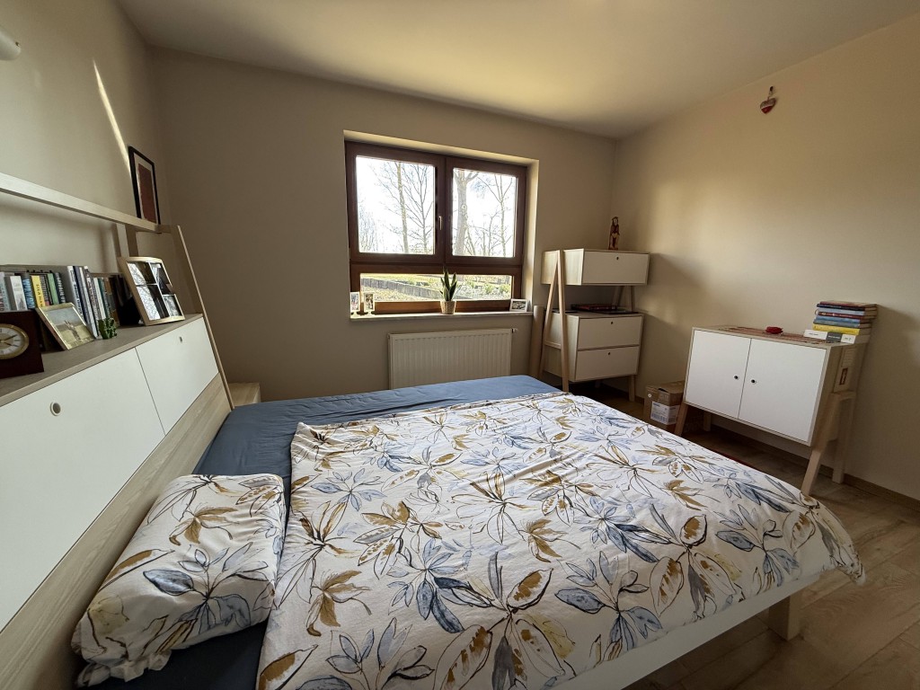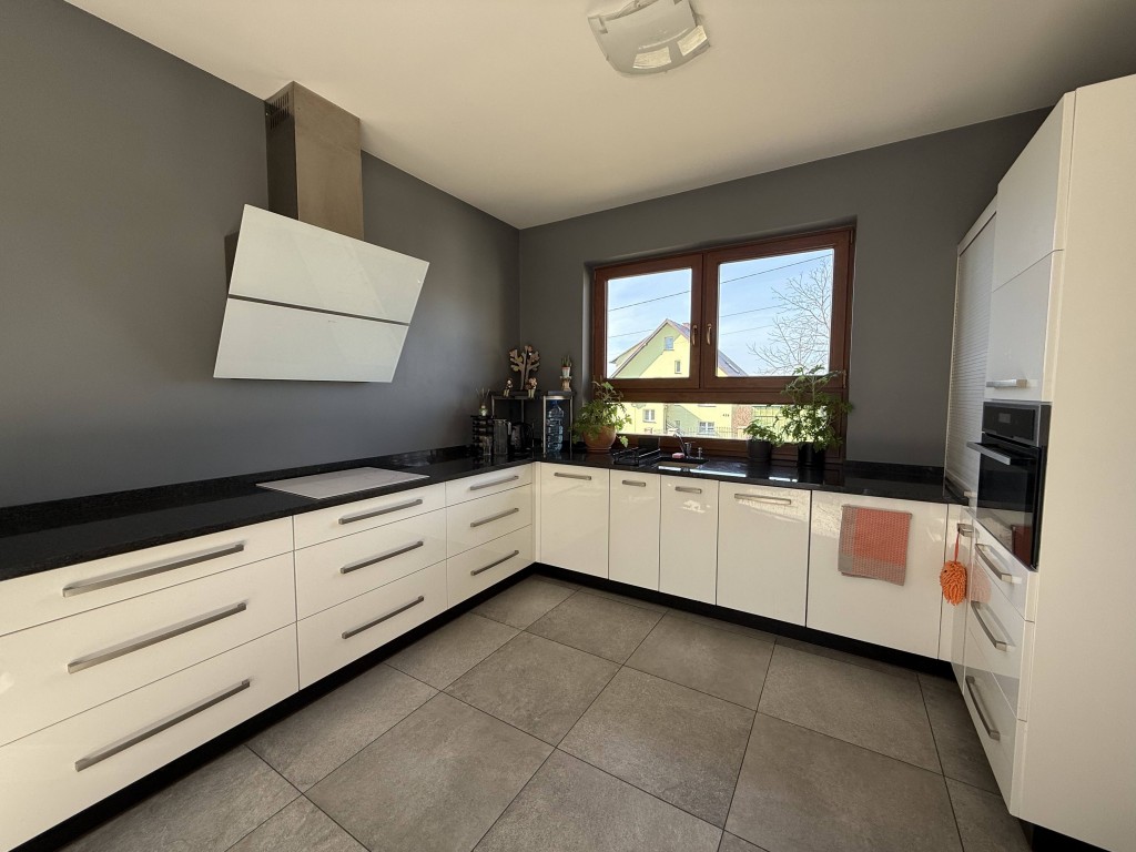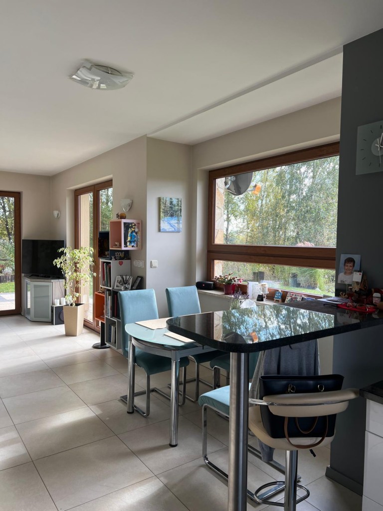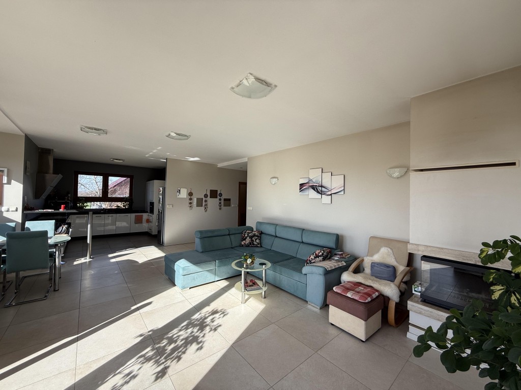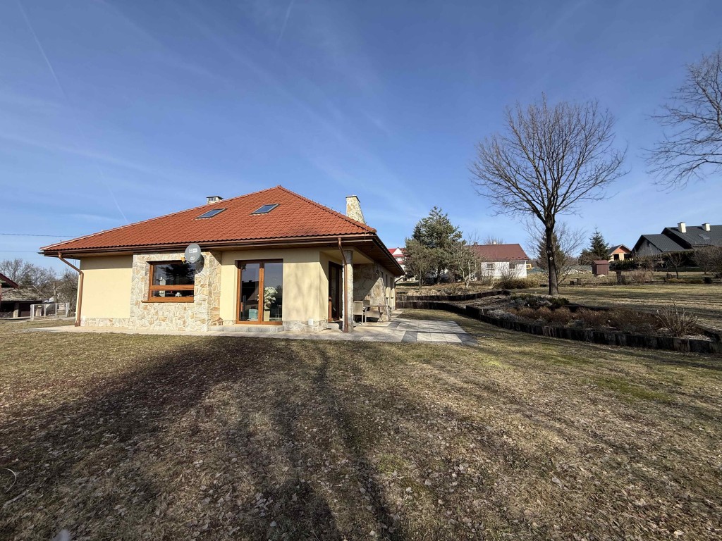 Dom wybudowany w 2015 roku o pow. mieszkalnej 116,64 m2 stoi na działce o pow. 1229 m2. Obecnie użytkowany jako parterowy, natomiast istnieje możliwość adaptowania poddasza do celów mieszkalnych, ponieważ podciągnięte są tam wszystkie media.