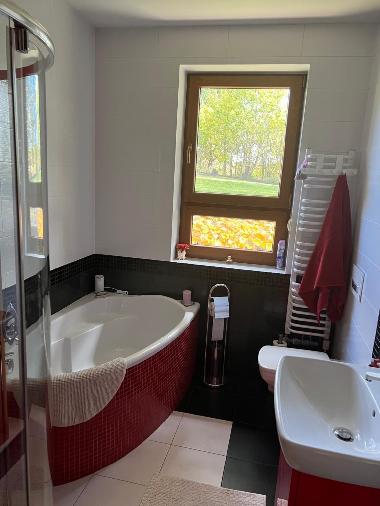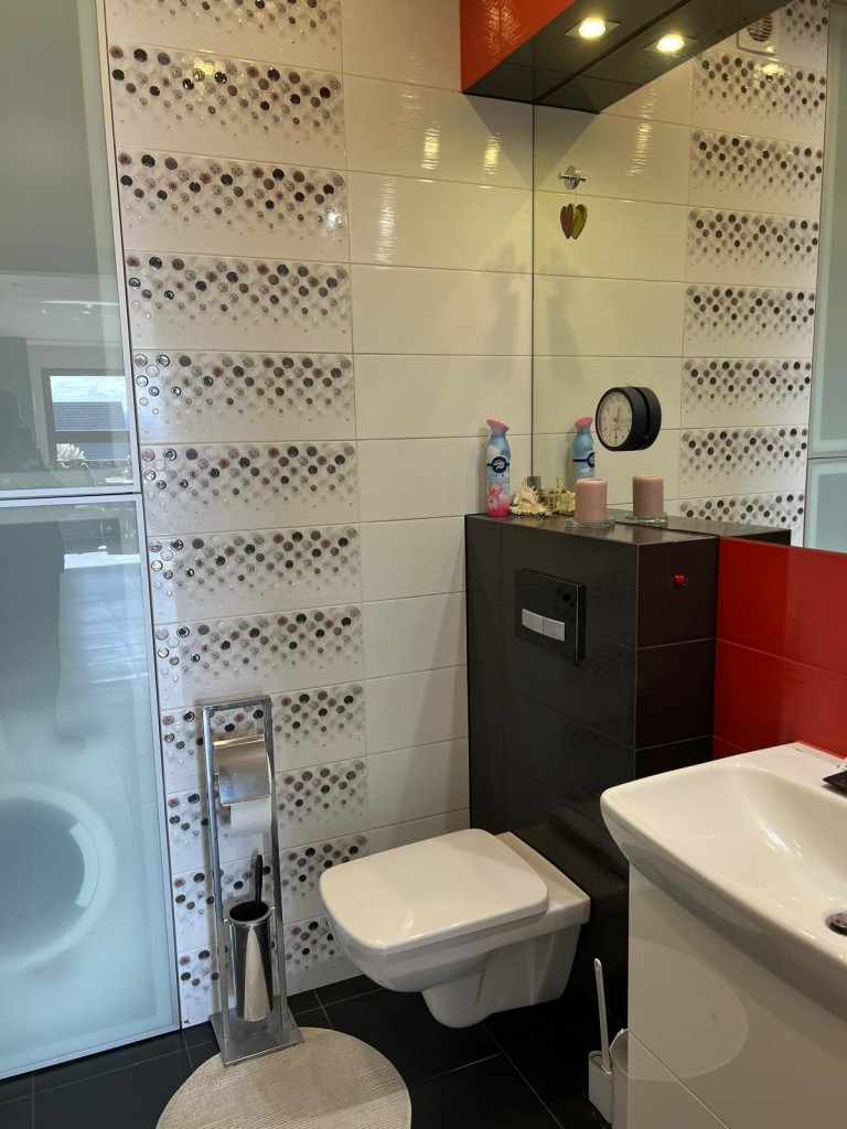 Z dwóch łazienek – jedna posiada wannę i kabinę prysznicową, druga zabudowaną pralkę z półkami.
