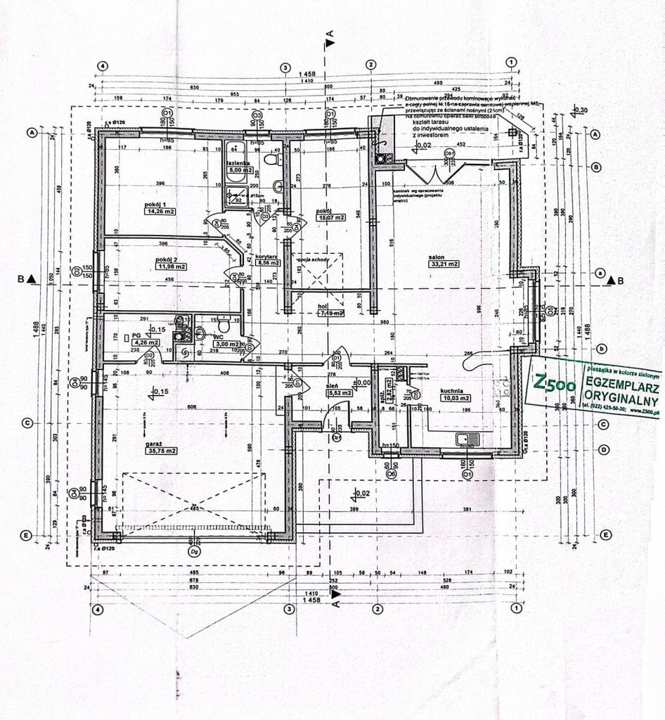 Dach kopertowy pokryty jest dachówką ceramiczną, a komin oraz elementy elewacji wykonane są z kamienia naturalnego.